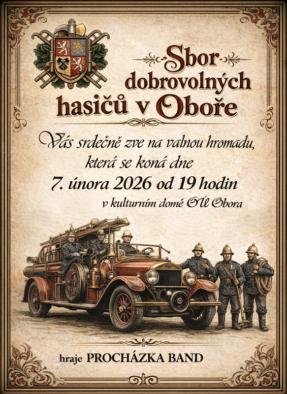 Zdravím a svolávám všechny členy JPO SDH Obora na den 23.01.2026 od 17.30 hod. ke školení ze zdravotní přípravy do nové hasičské zbrojnice. Účast všech velmi nutná.
